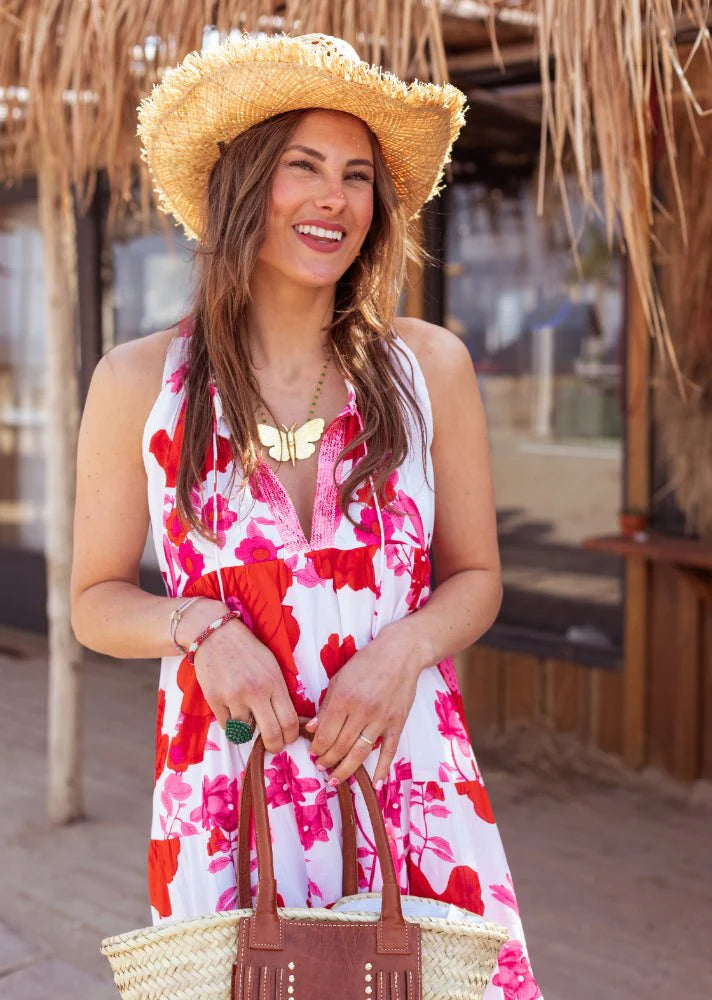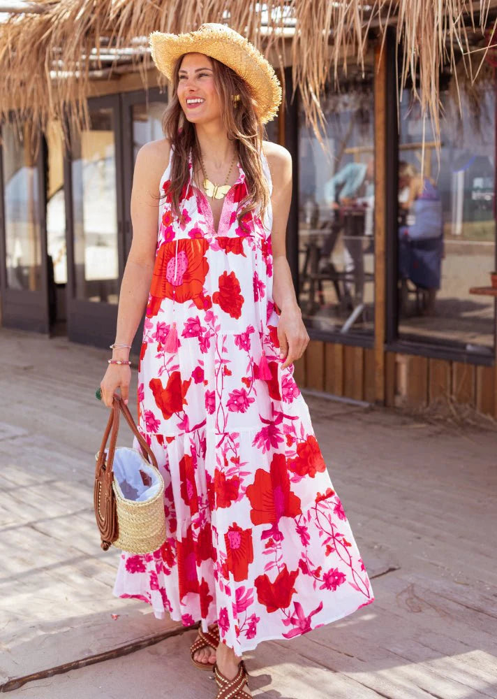 White Pink Flower Long Dress
